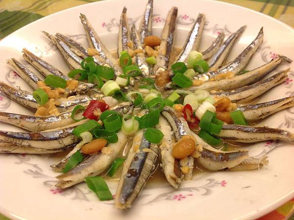 材料:新鮮熟的丁香魚、豆腐乳一塊、辣椒一個、萆一支、糖少許、酒適量。