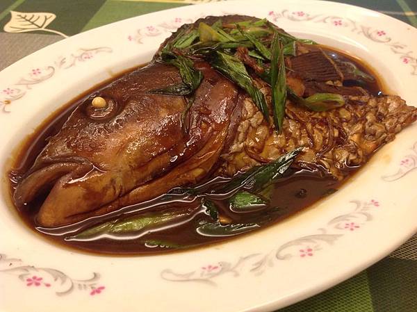 材料:草魚頭半個、青蒜1支、蔥、薑、醬油、冰糖、酒、鎮江香醋少許、塩少許。