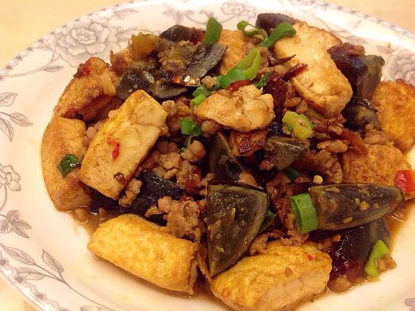 3. 鍋中留少許油,把肉末下鍋炒散,再將XO醬和辣椒醬加入續炒一下,再把豆腐和皮蛋回鍋,加佐料并淋一點水,小心翻一下略煮,起鍋前撒下蔥花即可。