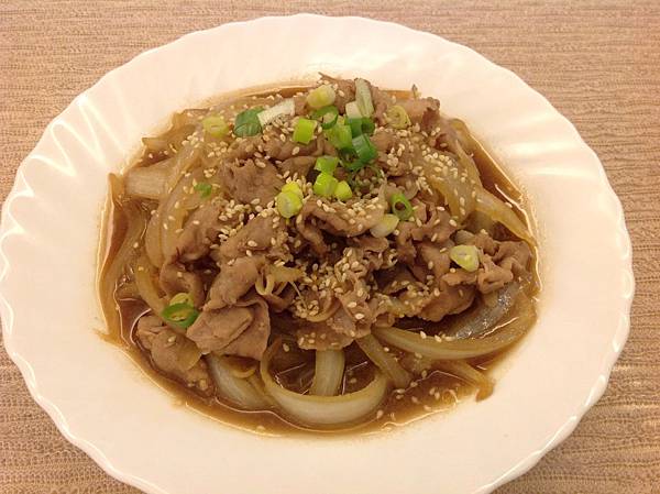 2. 起油鍋,先將洋蔥下鍋炒香,見洋蔥稍軟即可加入調味料并加半碗水,再把肉均勻的舖在洋蔥上,蓋上鍋蓋煮約2分鐘,見肉熟了拌炒一下即可盛盤,最後撒上芝麻就完成了!