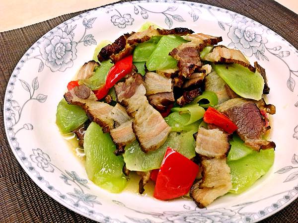 材料:萵筍1根、臘肉1小塊、辣椒1個、酒1大匙、糖2小匙。