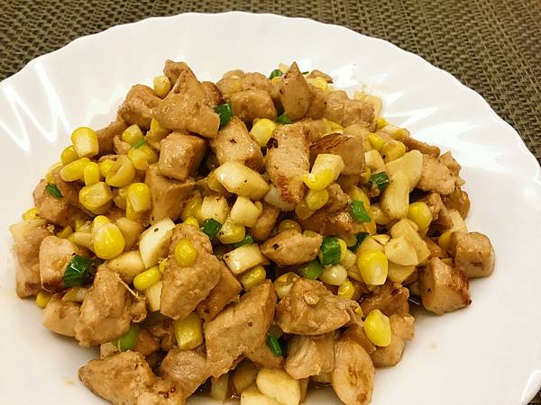 3. 鍋燒熱後淋少許油,先將雞丁下鍋煎炒至表面變色,接著將玉米、茭白筍下鍋,淋酒加糖用大火翻炒均勻至雞丁全熟,起鍋前撒下蔥花即可。