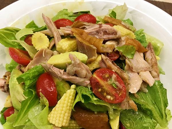 大姑給了我兩個酪梨,剛好今天孩子不回來吃飯天氣又悶熱,老公説隨便吃就好,我就用酪梨加了一塊燻雞胸肉和玉米筍、小番茄、生菜,再淋一點橄欖油、檸檬汁、胡椒鹽,輕鬆一拌就成我們兩老的晚餐了,真是相當好吃的健康沙拉!👍👍