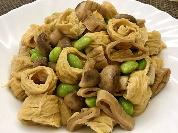 材料:豆腸3條、扁尖1個、蘑菇數個、毛豆半碗、鹽適量、糖1小匙、香油2小匙。