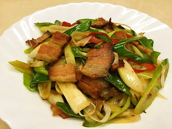 註:這盤菜用了兩棵大蔥,臘肉要先煮熟再續浸泡40分鐘才可以用,如此臘肉才不至於太鹹太硬,炒的時候要加一點糖、一大匙酒,二小匙醬油。